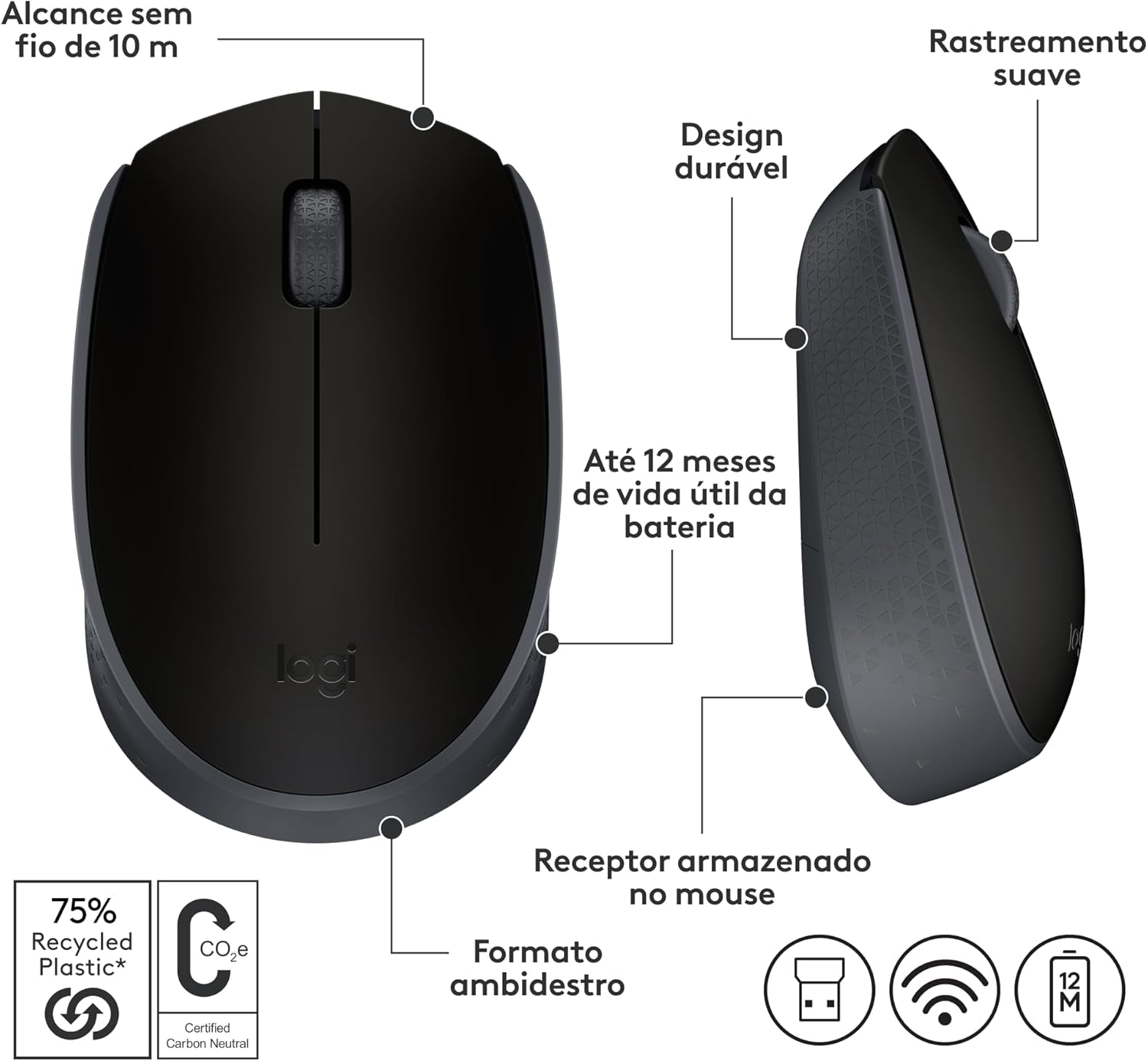 Mouse sem fio Logitech M170 com Design Ambidestro Compacto, Conexão USB e Pilha Inclusa – Preto