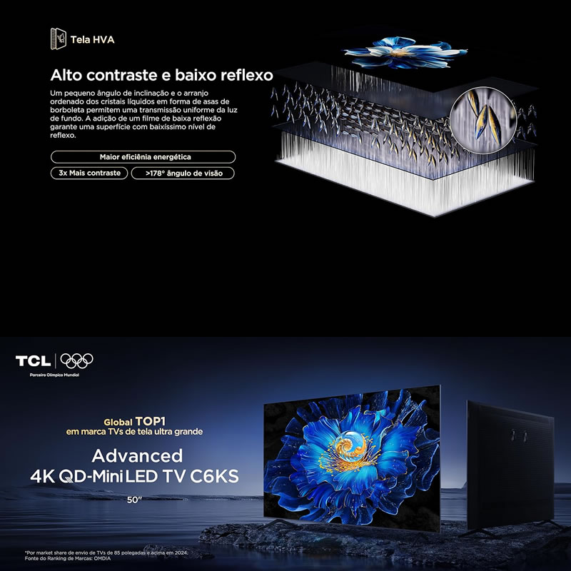 00054 Smart TV TCL 50” QLED Mini LED 4K: Marca TCL, modelo ano 2025 50C6KS, cor Preto, 4K QD-Mini LED TV 50” Polegadas, C6KS GOOGLE TV, DOLBY VISION, ATMOS, HDR10+, Wi-Fi dual band e Bluetooth integrados, HDMI 2.1 Comando de voz à distância, Google Assistente, ALLM e design sem bordas, Tecnologia de conectividade: Bluetooth e Wi-fi, Componentes incluídos: 01 Televisor 50″, 01 Controle Remoto, 1 Cabo Adaptador P2/RCA…